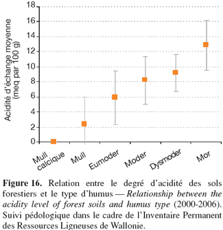 79Selon les résultats du suivi pédologique, le statut acido-basique des sols ne montre pas de relation évidente avec le type de peuplement forestier, même si un lien peut être observé entre les caractéristiques des litières et le type d'humus. Il existe en effet un gradient croissant d'acidité du mull calcique au mor. La variabilité au sein des différents groupes d'humus reste toutefois relativement importante (Figure 16, en document annexe).