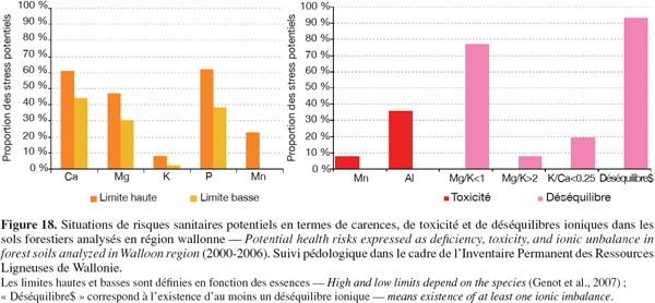 84Différents paramètres sont utilisés pour évaluer les risques potentiels de stress nutritif et de toxicité dans les sols forestiers. Les teneurs en éléments nutritifs (Ca, K, Mg, P) et en éléments phytotoxiques (Al, Mn) sont comparées à des seuils de risques sanitaires, adaptés à chaque essence forestière (Weissen et al., 1994 ; Genot et al., 2007).