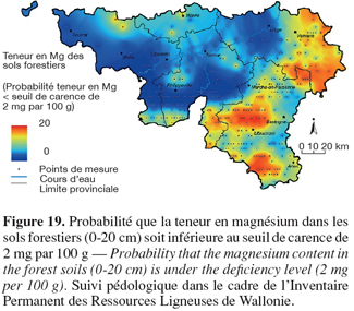 86La carte du risque de déficience en Mg biodisponible illustre parfaitement la régionalisation des stress trophiques potentiels qui touchent essentiellement le sud de la région wallonne (Figure 19, en document annexe). Si l'Ardenne et la région jurassique sont les régions forestières les plus touchées, on observe néanmoins une différenciation géographique à l'intérieur de ces unités, imputable à des spécificités d'ordre lithologique et pédologique principalement. La Haute Ardenne, quant à elle, est caractérisée par l'occurrence de stress potentiels pour la plupart des éléments nutritifs (Genot et al., 2007).