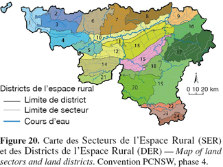 89En effet, la numérisation de la carte des sols de Belgique a permis la réalisation d'une stratification du territoire wallon sur une base géomorphopédologique qui a abouti à la définition de 196 Secteurs de l'Espace Rural (SER) pouvant être regroupés en 24 Districts (DER) (Figure 20, en document annexe). Ceux-ci sont des modèles d'organisation des sols en fonction de la géologie et du relief. Chaque unité présente une signature géomorphopédologique propre et un nombre restreint de principaux types de sols dominants.